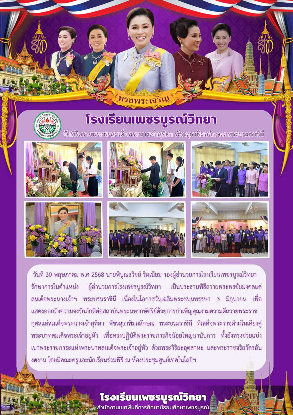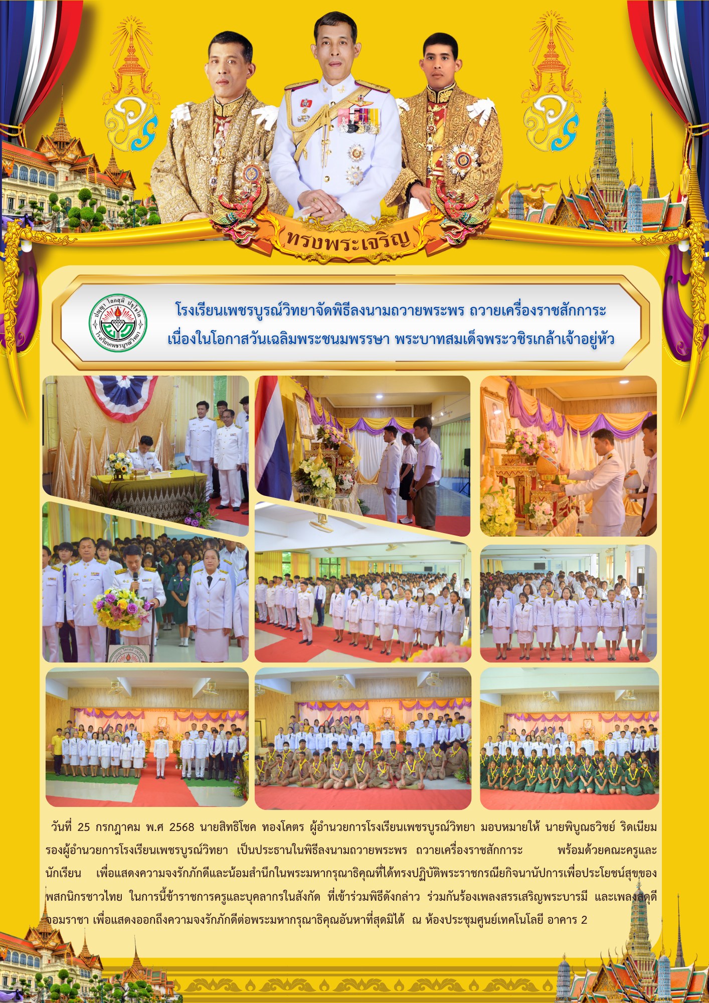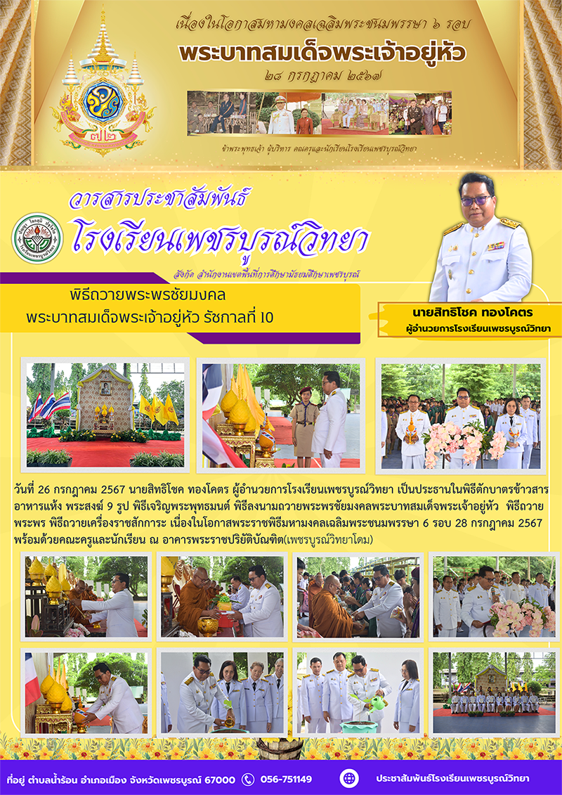 | โรงเรียนเพชรบูรณ์วิทยาจิดกิจกรรมทำบุญตักบาตรถวายเป็นพระราชกุศลแด่องค์พระบาทสมเด็จพระเจ้าอยู่หัวและจัดกิจกรรมถวายพระพรเนื่องในวันเฉลิมพระชนมพรรษาพระบาทสมเด็จพระปรเมนทรรามาธิบดีศรีสินทรมหาวชิราลงกรณ พระวชิรเกล้าเจ้าอยู่หัว รัชกาลที่ 10 ขอพระองค์ทรงพระเจริญด้วยเกล้าด้วยกระหม่อมขอเดชะข้าพระพุทธเจ้าคณะครและนักเรียนโรงเรียนเพชรบูรณ์วิทยาู |