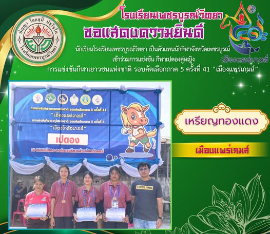 | โรงเรียนเพชรบูรณ์วิทยาขอแสดงความยินดีกับตัวแทนนักเรียนโรงเรียนเพชรบูรณ์วิทยา ที่เป็นตัวแทน จังหวัดเพชรบูรณ์ร่วมแข่งขันกีฬาแฮนบอลชายหาดในการแข่งขั้นคัดเลือกตัวแทนนักกีฬาภาค 5 เพื่อเข้าร่วมการแข่งขันกีฬาแห่งชาติ โดยนักกีฬาแฮนบอลชายหาดหญิงของโรงเรียนเพชรบูรณ์วิทยา ได้ผ่านการคัดเลือกเป็นตัวแทนนักกีฬาภาค 5 ไปร่วมการแข่งขันระดับชาติต่อไป | |